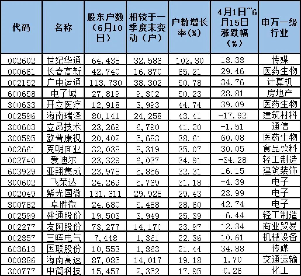 与股东户数下降相对的是,截至6月10日,两市有75家公司股东户数出现增加,增幅10%以上的有37家,20%以上的有21家,30%以上的有12家。