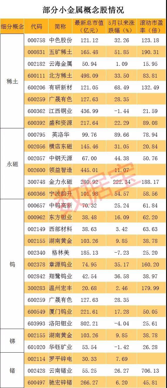稀土龙头一个多月暴涨3倍,下一个龙头是谁?从近期市场表现来看,钨概念股表现相当强势,章源钨业已经连续3个涨停板,锑概念两只概念股湖南黄金和华钰矿业均大幅上涨,涉矿的梅雁吉祥涨停,锗概念股相对表现最弱。