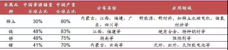 中泰证券认为:稀土、钨、锑和锗四个品种是典型的“中国优势小金属”,尤其是前三者,资源优势最坚实,其也广泛和集中分布在“内蒙古、江西、福建、湖南、广东、广西、四川省(区)”等地。其中,我国稀土资源储量在全球占比达30%,产量占比达到80%。而钨、锑和锗三个品种资源储量在全球占比均超过40%,而产量占比则均超过70%。