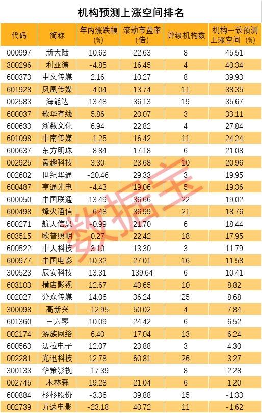 从机构预测情况来看,有6只个股最新价距离机构一致预测目标价有30%以上的上涨空间。如8家机构评级的新大陆,一致目标价为23.15元,较现价有45%以上的上涨空间。4家机构评级的利亚德,一致目标价10.18元,较现价有40%多上涨空间。此外,中文传媒、凤凰传媒、海能达、歌华有线等个股一致目标价较现价均有30%以上的上涨空间。