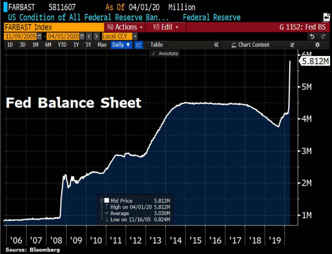 4月1日,美联储公布的周报显示,美联储资产负债表规模达到5.81万亿美元,一周前的3月25日为5.3万亿美元,一周内增长了5570亿美元。如果加上4月2日的美联储最新操作量885亿美元和市场预期4月3日购买量将再增加900亿美元,则美联储在4月3日的资产负债表规模将达6万亿美元。