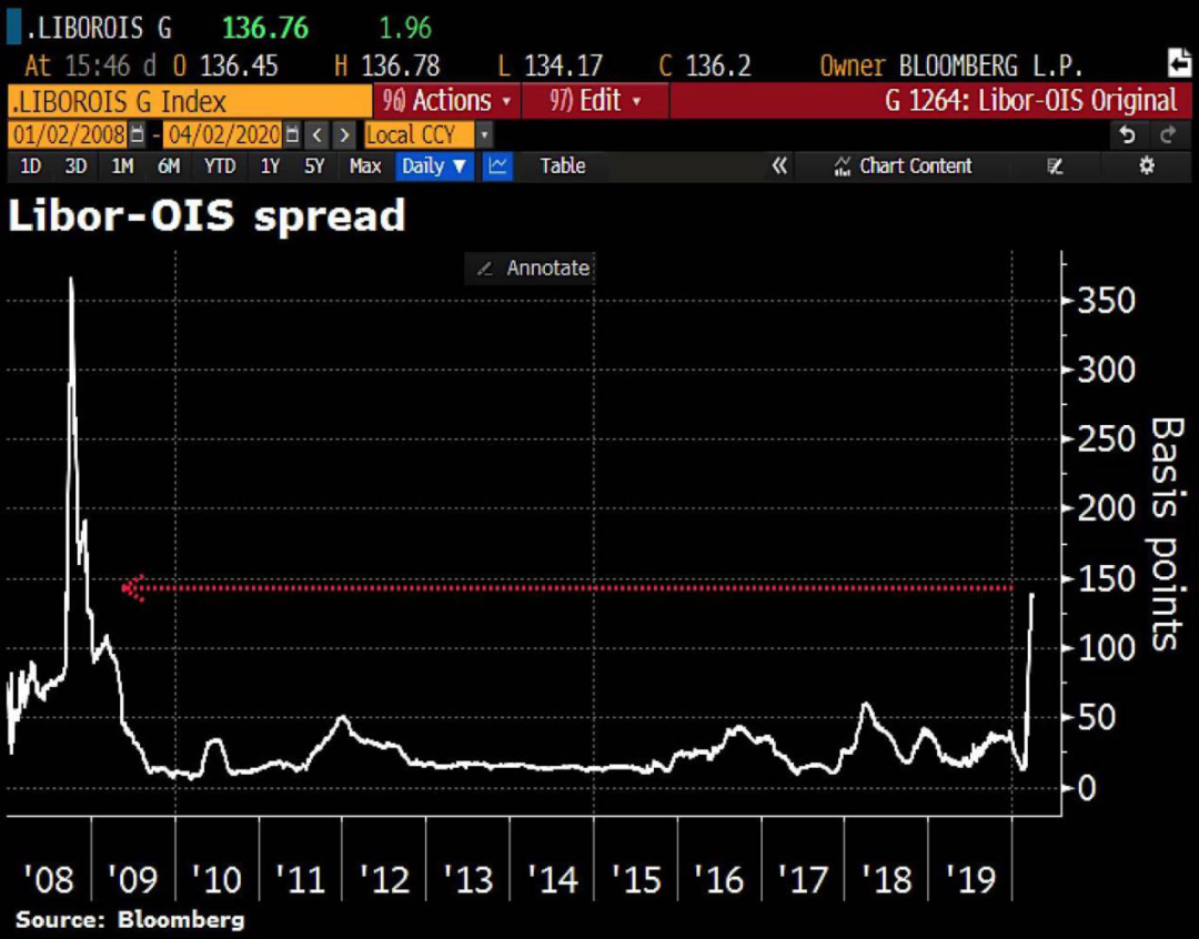 但是,没有得到美元互换的新兴市场国家,面临的美元荒丝毫没有减轻。衡量美元流动性压力的Libor-IOS利差仍然居高不下,市场对于美元需求仍然特别旺盛。4月3日,IMF总裁格奥尔基耶娃称,已经有85个国家向IMF寻求短期紧急援助,这是2008年金融危机后寻求帮助人数的两倍。