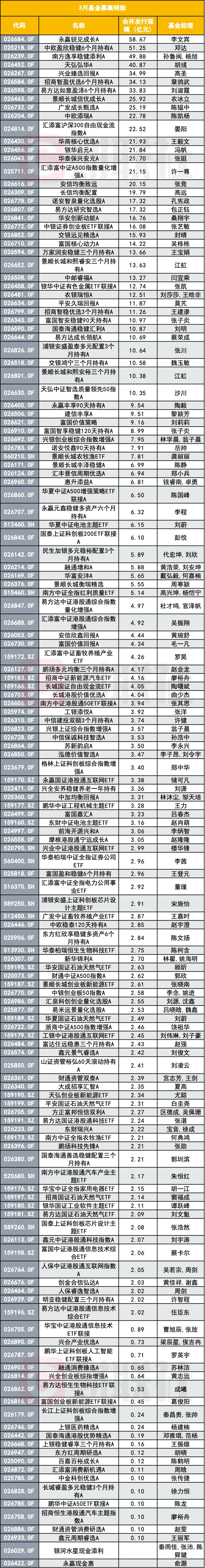 再往后看,富国基金、汇添富基金、天弘基金、招商基金等公司,3月成立产品的合并发行规模也均在30亿元以上。这样的分布也说明,月度募集成绩并不完全取决于成立产品数量,单只头部产品能否快速做出规模,仍然是拉开基金公司之间差距的关键变量。