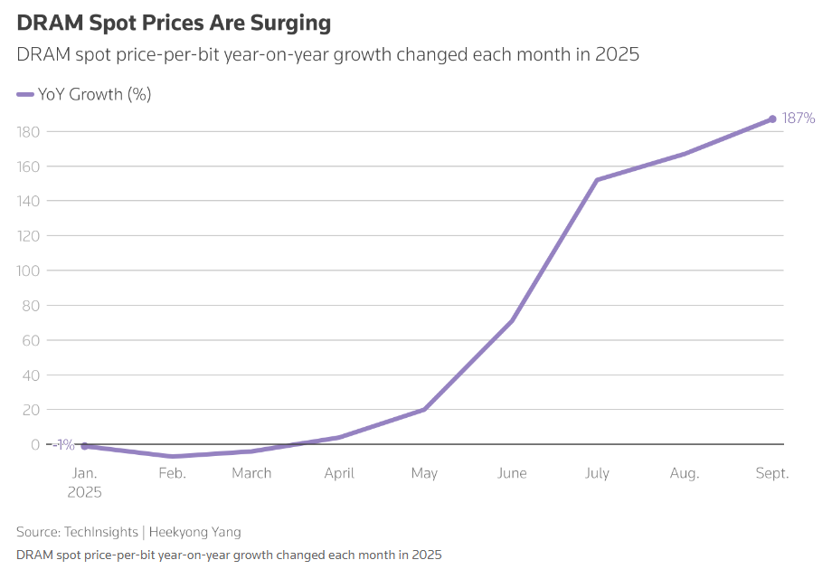 此外,TechInsights的数据显示,适用于多种设备的DRAM芯片现货价格,9月同比上涨近两倍,而4月时同比涨幅仅为4%。