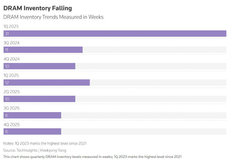 本季度DRAM芯片的平均库存周期已从去年同期的10周、2023年初的31周,降至仅8周。