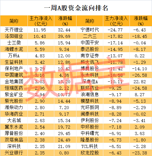 个股方面,剔除近一个月上市的次新股,本周共76股主力资金净流入超亿元。锂电池概念股天齐锂业主力资金净流入11.95亿元居首,该股本周大涨32.44%。另一只锂电池概念股洛阳钼业主力资金净流入为10.43亿元,本周上涨39.69%。本周净流入规模较大还有的士兰微、海螺水泥、万科A、生益科技、保利地产等。