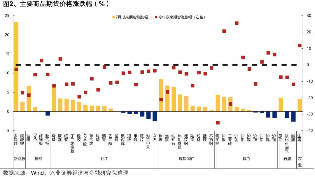期货价格方面,7月以来价格上涨较多的品类集中在新能源产业链(多晶硅、碳酸锂)、黑色系(焦煤焦炭、铁矿石、螺纹钢等)、建材(玻璃、PVC)、化工(碱、尿素、纸浆、橡胶、苯乙烯等)、有色(氧化铝、银、工业硅等)、原油、生猪;年初以来价格上涨较多的品类包括有色(金、银、锡、铜、铝)、生猪、尿素、纤维板。