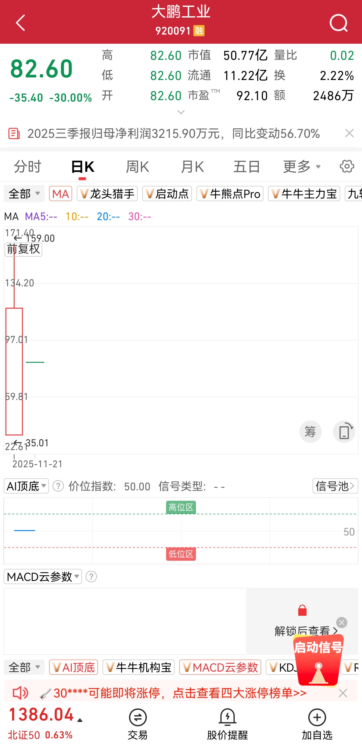 今日收盘跌幅最大的是大鹏工业(920091),且遭遇一字跌停,收盘时跌停板封单达6.12万手。该股于上周五(11月21日)登陆北交所,上市首日盘中最大涨幅达到16.67倍,首日收盘涨幅达到12.11倍,这两项数据均为2025年以来上市新股的最高值。