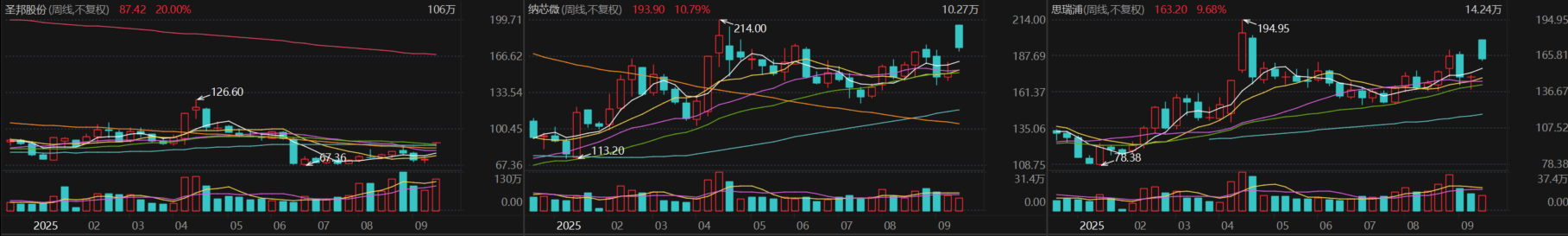 半导体板块再度活跃,模拟芯片方向涨幅居前。其中,圣邦股份20CM涨停,纳芯微涨超10%,思瑞浦涨超9%,三只个股均创6月以来新高。