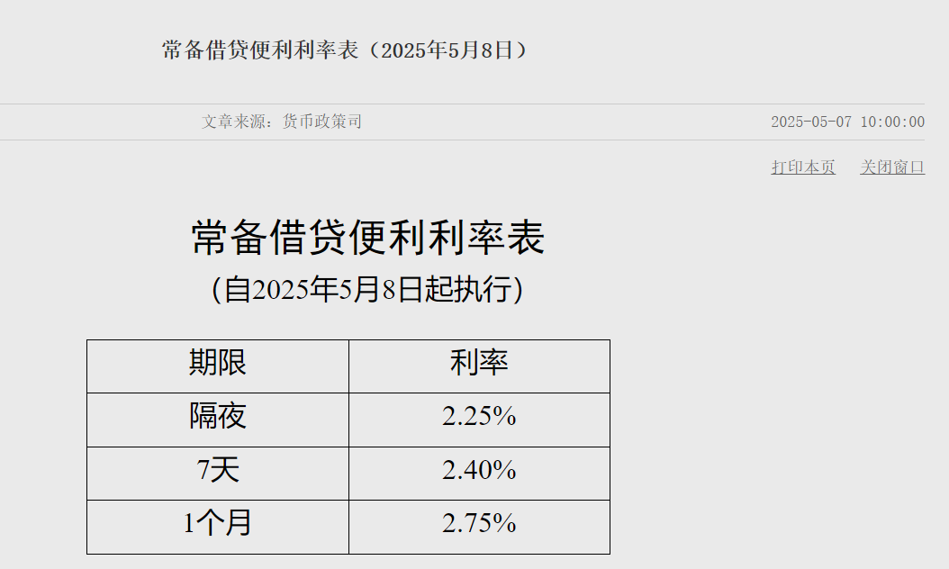 5月7日,中国人民银行更新常备借贷便利利率表,自5月8日起,隔夜、7天、1个月常备借贷便利利率分别调整为2.25%、2.40%、2.75%,均较此前下调10个基点。