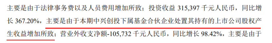 比如中兴通讯,公司上半年实现归母净利润14.71亿元,扣非净利润为6.12亿元。报告期内,公司投资收益为3.15亿元,同比增长367.20%,主要是由于本期中兴创投下属基金合伙企业处置其持有的上市公司股权产生收益增加所致。