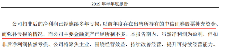 作为曾经的“国民牙膏”,两面针在半年报中坦言:“公司扣非后的净利润已经连续多年亏损。以前年度存在出售所持有的中信证券股票补充资金、而弥补亏损的情况,而公司主要金融资产已经所剩不多。报告期内,虽然净利润为盈利,但扣非后净利润依然亏损。”