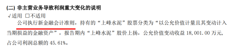 比如浙江富润。公司上半年实现归母净利润2.77亿元,同比增长266.22%。公司表示,自1月1日起执行财政部新修订的《企业会计准则第22号—金融工具确认和计量》新金融工具准则,公司持有的上峰水泥股票公允价值变动收益为1.80亿元,占公司利润总额的45.61%。