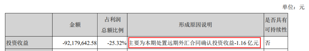 以奥马电器为例。公司称,报告期内,受国内宏观经济形势、金融政策和金融行业整体环境的影响,公司金融板块业务实现营业收入2.68亿元,合并报表范围亏损1594.97万元,同比下降110.80%。财报显示,公司本期处置远期外汇合同确认投资收益-1.16亿元。