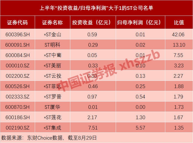 值得注意的是,有10家ST公司的投资收益超过当期归母净利润。