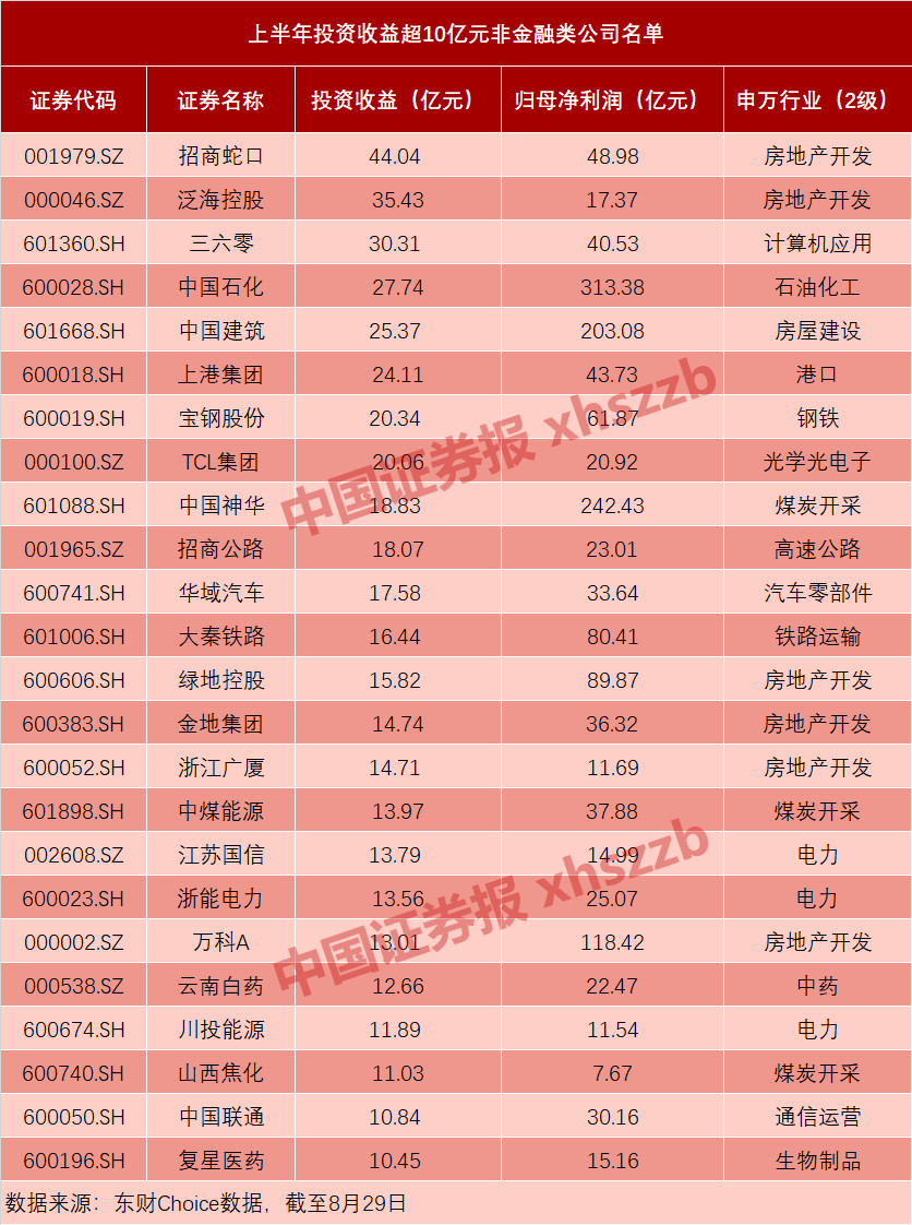 从个股看,投资收益规模最高的公司为招商蛇口,达44.04亿元;其次是泛海控股,为35.43亿元;三六零排在第三,为30.31亿元。