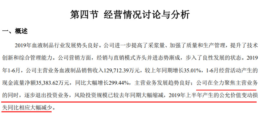 在刚披露的2019年半年度报告中,上海莱士表示,公司在全力聚焦主营业务的同时,逐步退出投资业务,风险投资规模已较去年同期大幅缩减,今年上半年产生的公允价值变动损失同比相应大幅减少。