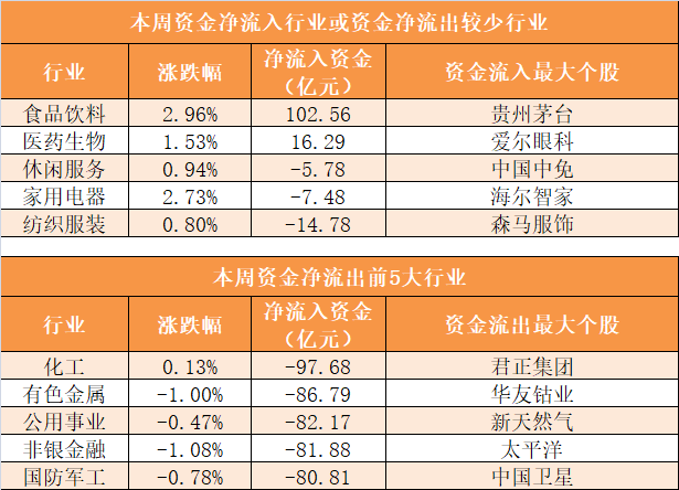 28个申万一级行业中,本周2个行业实现资金净流入,其中食品饮料行业净流入102.56亿元居首。