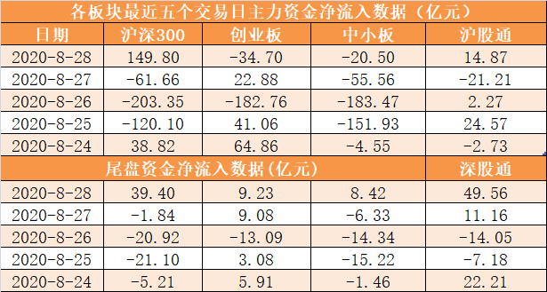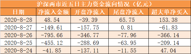 本周两市主力资金累计净流出1393.69亿元。其中周五(8月28日)主力资金开盘净流出39.39亿元,尾盘净流入65.75亿元,全天净流入48.54亿元。