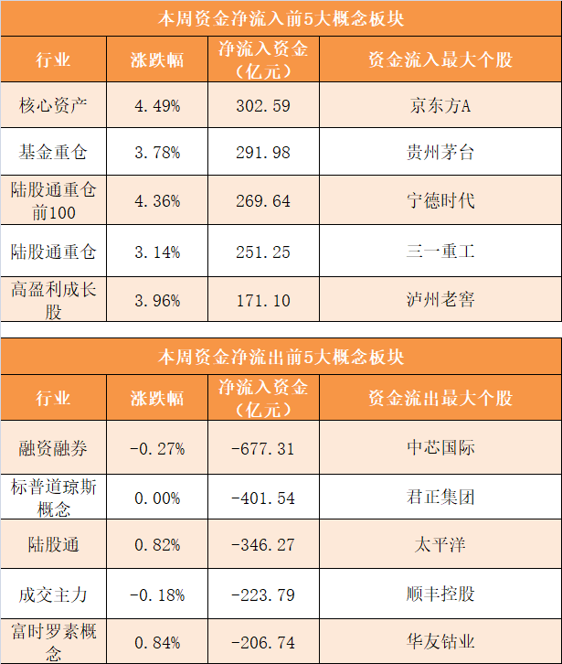 概念板块方面,本周核心资产、基金重仓等概念板块资金呈现净流入,其中核心资产概念净流入302.59亿元居首。