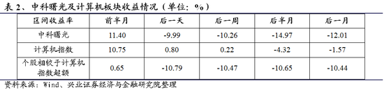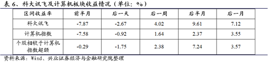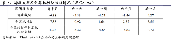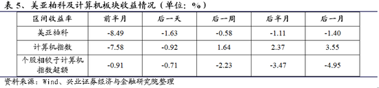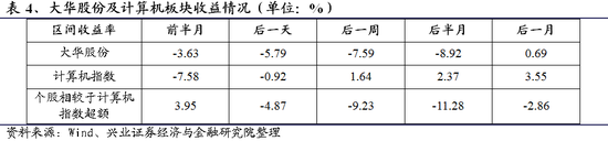 此次涉及的公司相对较多,计算机指数短期内跑输大盘,于半月后修复为正。从前半月、后一天、后一周、后半月、后一月的维度观察,绝对收益率分别为-7.58%、-0.92%、1.64%、2.37%,3.55%,板块区间收益率一周后即转正。从相对收益来看,计算机板块相较于上证指数的区间超额收益率分别为-3.42%、-1.21%、-1.31%、 0.67%、0.58%,半月后转正,跑赢大盘。