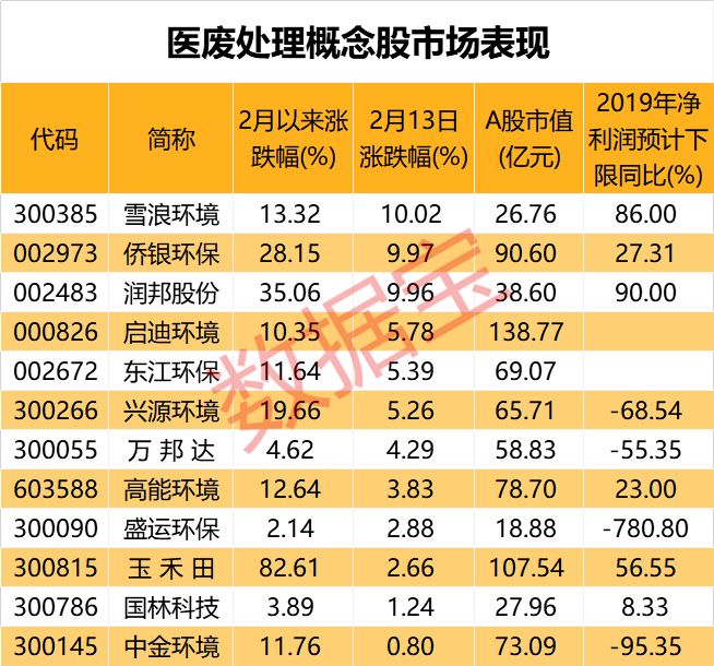 而从公司1月份公布的业绩数据来看,润邦股份表现不俗,公司预计去年净利润为1.24亿元至1.57亿元,同比增长90%至140%。除润邦股份外,其他医废处理概念股业绩预计增幅较大的还有雪浪环境、玉禾田、侨银环保、高能环境、国林科技等。