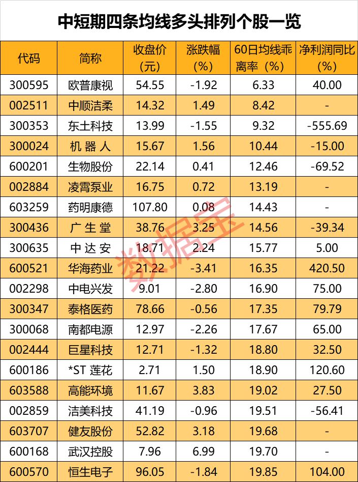 一般来说,均线多头排列代表买方力量强大,后市由多方主导行情概率较大。证券时报•数据宝统计,截至2月13日,119只个股5日、10日、20日、60日四条均线近日呈多头排列。其中欧普康视、中顺洁柔、东土科技股价与60日均线的乖离率最小,分别为6.33%、8.42%、9.32%。