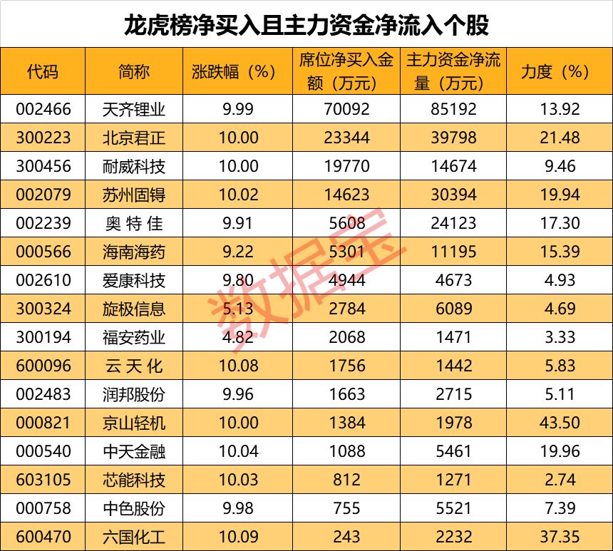 从盘口资金流向来看,主力资金净流入超千万且龙虎榜净买入个股共有16只,其中天齐锂业、北京君正、苏州固锝等个股资金净流入金额最大。净流入力度最大的个股有京山轻机、六国化工、北京君正,净流入力度分别为43.50%、37.35%、21.48%。