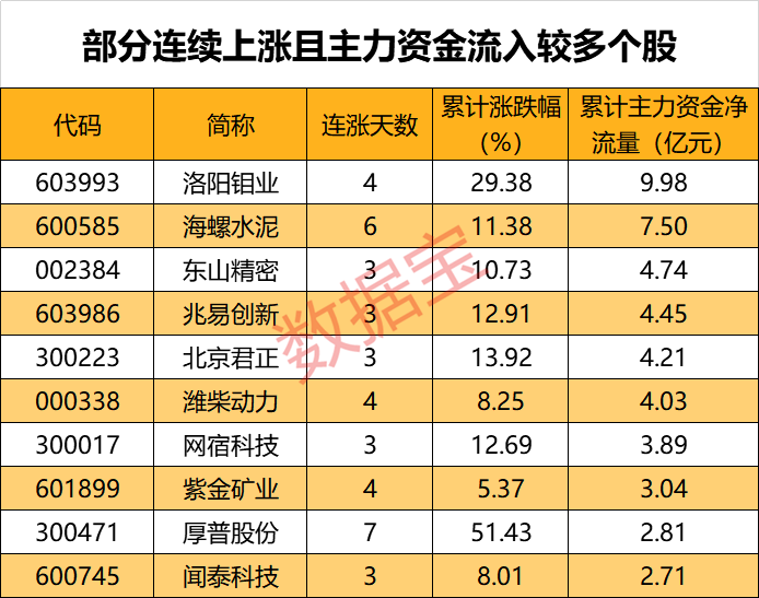 值得注意的是,224只连续上涨个股中,31只个股期间主力资金累计净流入超过亿元。其中,累计资金流入最多的为洛阳钼业,主力资金累计流入9.98亿元。