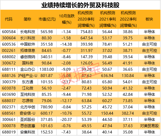不过不管美国大选结果如何,业绩持续高增长股依然会成为市场关注焦点。统计显示,上述133股中,机构一致预测2020年至2022年净利润增幅超过35%,且10月份以来跑输大盘的个股共有17只,包括思创医惠、拓维信息、北方华创等。