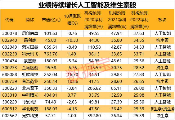 据此,数据宝梳理A股有关维生素、抗生素以及人工智能相关概念股共有67只,10月份以来跑输大盘且机构一致预测2020年至2022年净利润增幅超过25%的个股有13只,包括普洛药业、紫光国微、中科曙光等,股价小幅上涨的有科大讯飞、兄弟科技等。