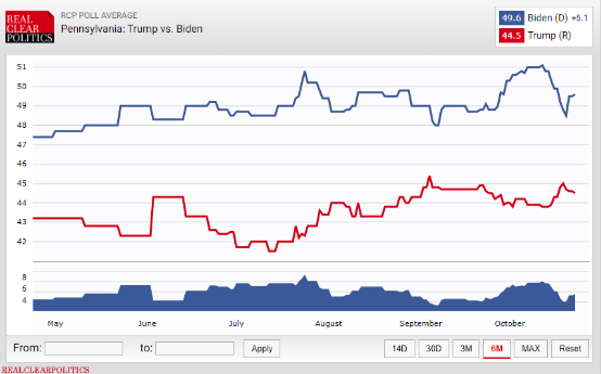 距离选举仅剩不到10日,究竟谁能从这场竞赛中胜出,先来看看市场的声音。根据美国RCP民调结果统计显示,共和党特朗普支持率不到45%,而民主党拜登支持率比特朗普要领先,接近50%,但当前的支持率并不能代表最终的结果不会发生变化。