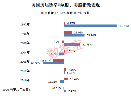 先对比中、美指数的表现来看,美国历届总统大选年(1992年至2016年,每隔4年数据),美国道琼斯工业平均指数涨多跌少,2020年截至当前,道指属于微涨状态;再看A股市场,截至10月23日,年内沪指上涨7.47%,跑赢同期道指。在全球资本市场联动机制下,未来美国股指的任何表现可能都会影响到A股。