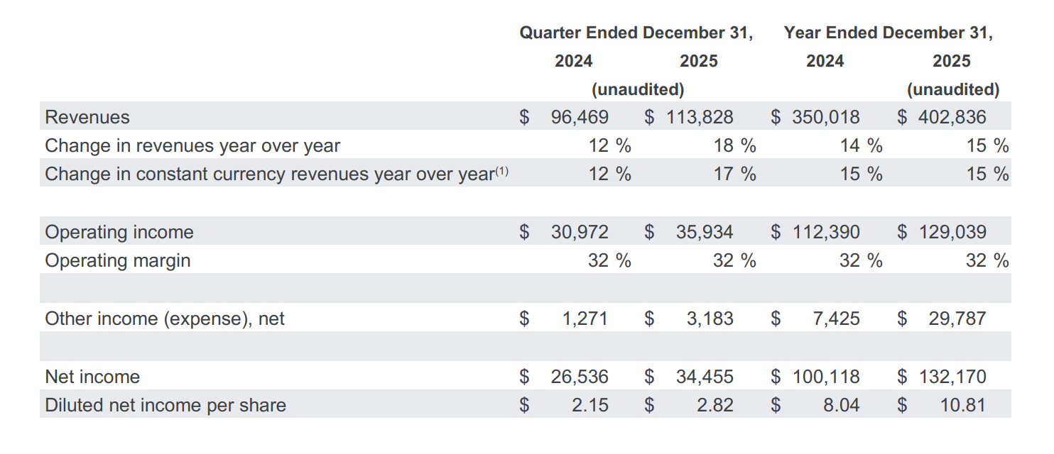 财报显示,Alphabet第四季度实现营收1138.3亿美元,同比增长18%,净利润344.6亿美元,同比增长29.8%,高于市场预期。2025年全年,谷歌营收达到4028.4亿美元,同比增长15%;净利润达到1321.7亿美元。