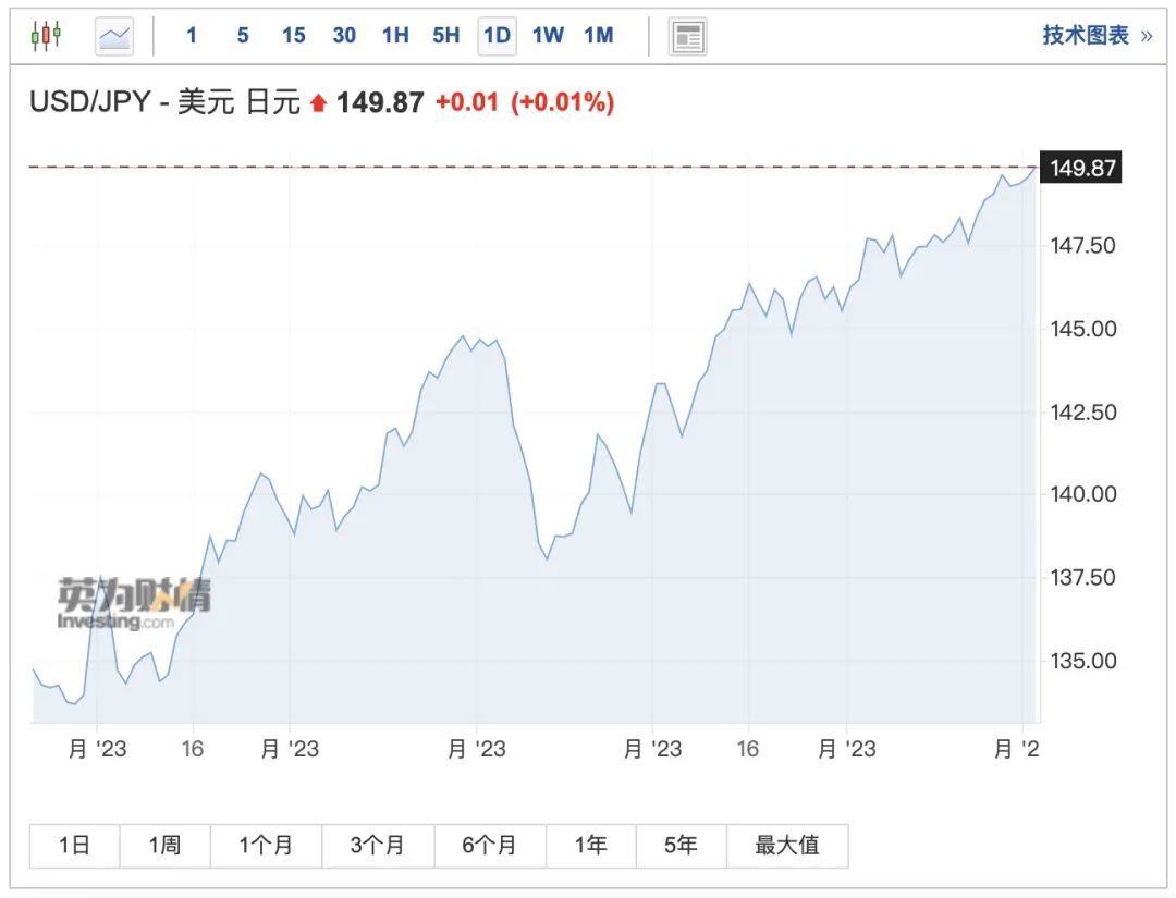同时,日元也遭到了猛烈抛售,一度跌至1美元兑149.87日元,为2022年10月以来最低水平,加剧了市场对日本当局将进行干预以支撑日元汇率的担忧。