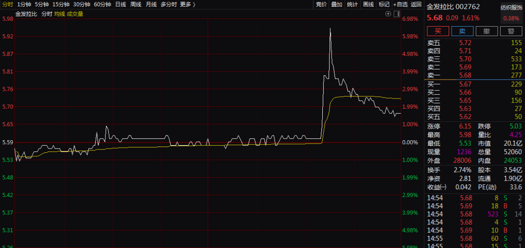 金发拉比最高冲至5.98元,收盘仅报5.68元。