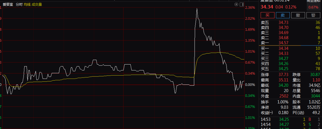 爱婴室则在冲高后一度翻绿,最后勉强收红。
