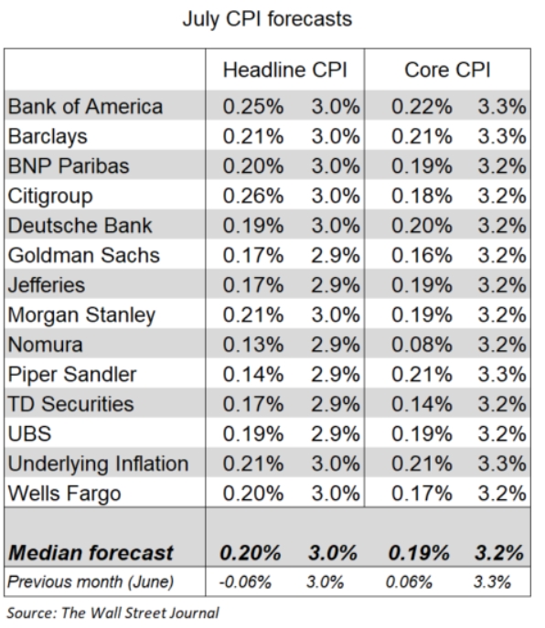 好消息是,目前投行们对7月CPI下降的预期普遍比较缓和——根据“美联储传声筒” Nick Timiraos的统计,各大投行对CPI与核心CPI年率的中位预期分别为3.0%和3.2%。6月的数据分别为3.0%和3.3%。