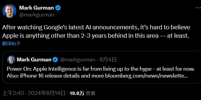 看完发布会后,知名苹果爆料人马克·古尔曼在社交媒体上哀叹称,看完谷歌的发布会,很难相信苹果在AI领域已经“至少落后2-3年”。