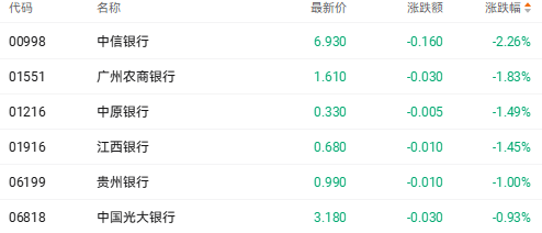 受保险股拖累,银行股同步走弱。截至收盘,中信银行(00998.HK)跌2.26%、中原银行(01216.HK)跌1.49%、贵州银行(06199.HK)跌1%。