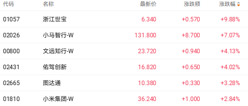 截至收盘,浙江世宝(01057.HK)涨9.88%、小马智行-W(02026.HK)涨7.07%、文远知行-W(00800.HK)涨4.13%。