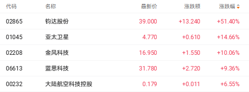 截至收盘,钧达股份(02865.HK)涨51.40%、亚太卫星(01045.HK)涨14.66%、金风科技(02208.HK)涨10.06%。