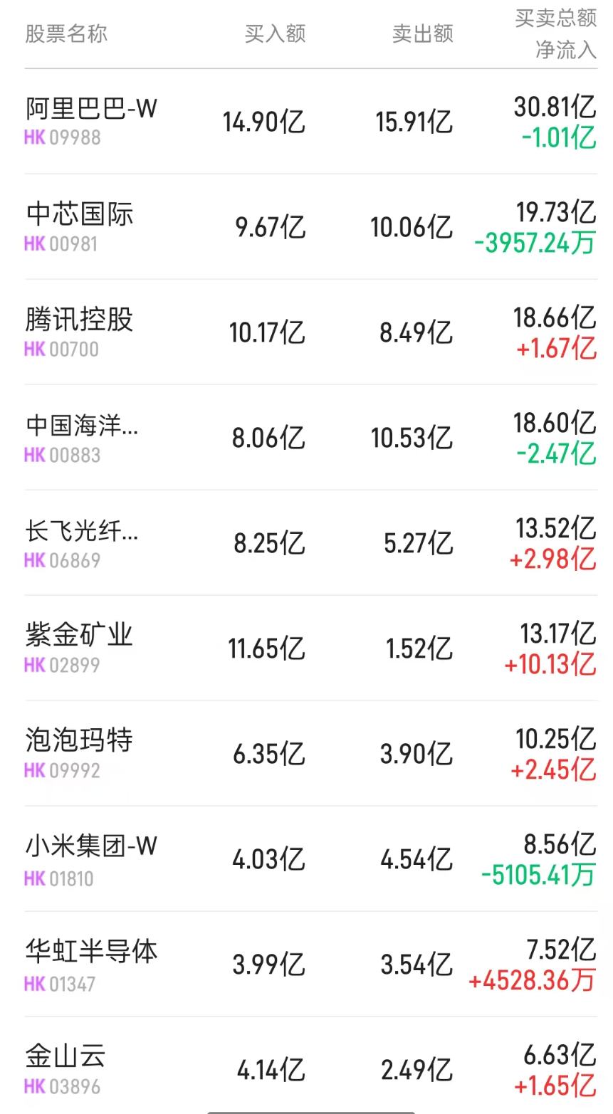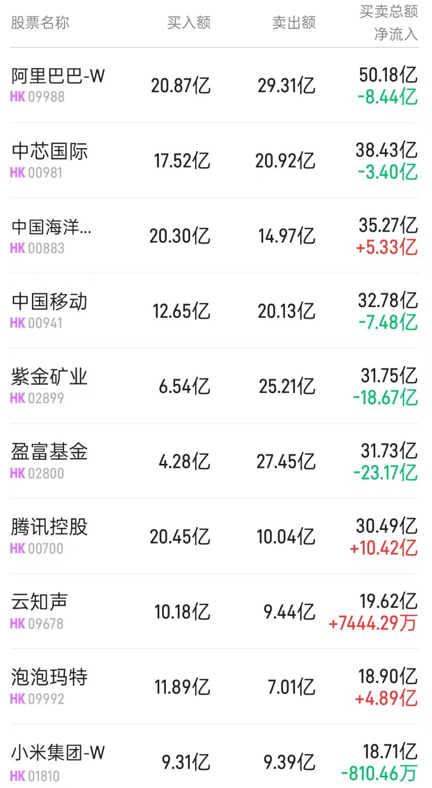 此外,中国移动(00941)、紫金矿业(02899)、阿里巴巴-W(09988)分别遭净卖出7.48亿、8.54亿、9.44亿港元。
