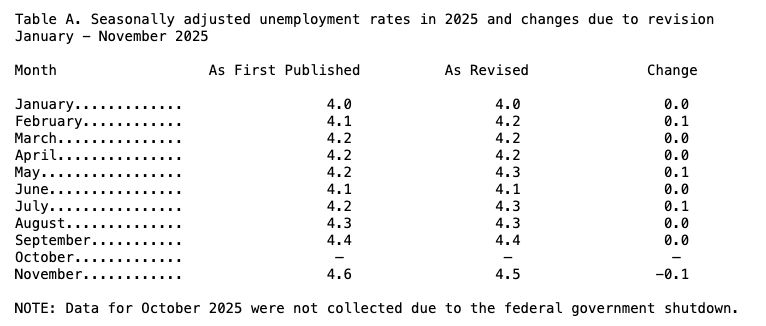 受去年底美国政府创纪录停摆的影响,非农报告直到今天才恢复按时发布状态。最新报告也调整了前两个月的就业人数,其中11月从增加6.4万人下修至5.6万人,10月从减少10.5万人下修至减少17.3万人,两个月合计下修7.6万人。