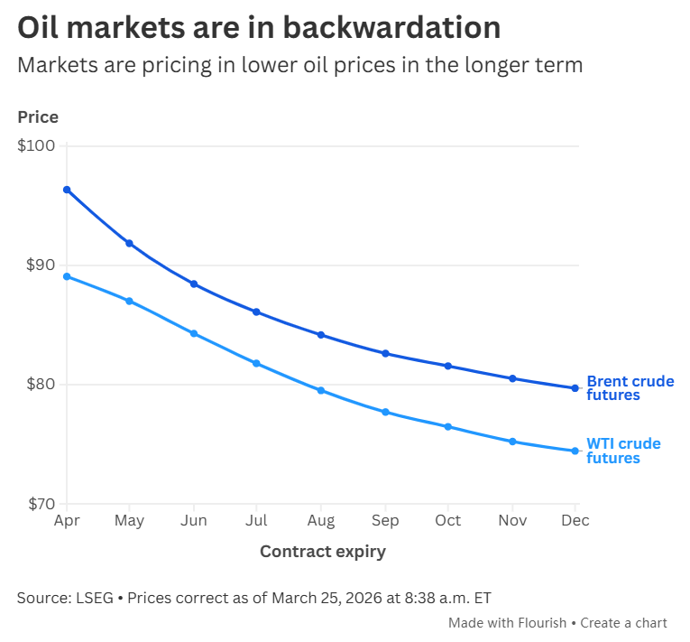 自美伊战争爆发以来,国际油市持续震荡。分析师指出,油市目前已进入“现货溢价”(backwardation)状态,表明交易员预期美伊冲突将快速得到解决,且风险溢价已被计入能源价格中。