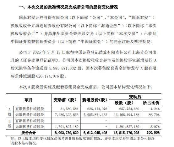 3.国泰君安、海通证券尚需办理吸收合并变更事宜的工商登记或备案手续,包括海通证券的法人资格注销及国泰君安的公司名称变更、注册资本变更、公司章程修订等事宜;