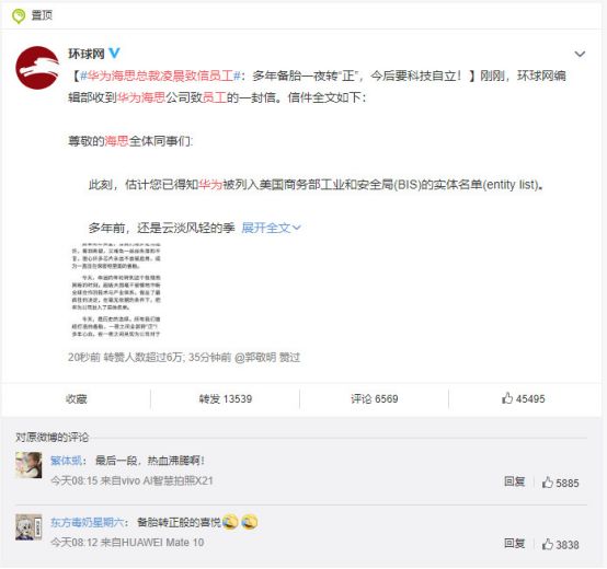 邮件提到,为了这个以为永远不会发生的假设,海思走上了科技史上最为悲壮的长征,为公司的生存打造“备胎”。超级大国在毫无依据的条件下,把华为公司放入了实体清单。“今天,是历史的选择,所有我们曾经打造的备胎,一夜之间全部转‘正’!”