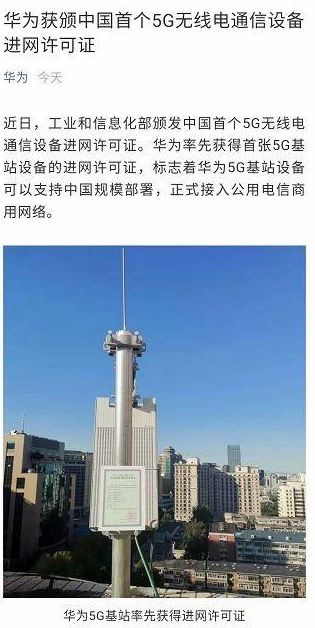 10月25日下午,华为官方微信发布重磅消息:工业和信息化部颁发中国首个5G无线电通信设备进网许可证,华为率先获得首张5G基站设备的进网许可证,标志着华为5G基站设备可以支持中国规模部署,正式接入公用电信商用网络。