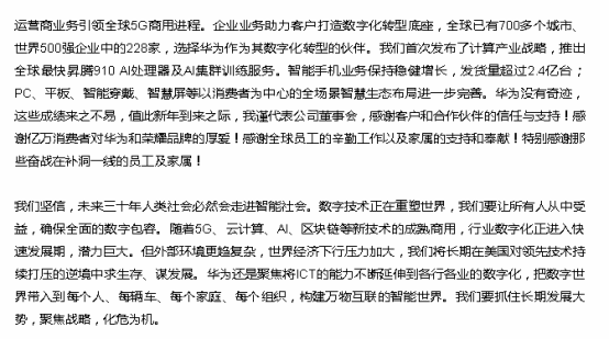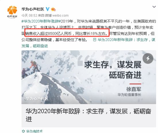 12月31日,华为心声社区官微发布了华为轮值董事长徐直军的《华为2020年新年致辞:求生存,谋发展,砥砺奋进》,致辞中公布了华为2019年预计业绩。