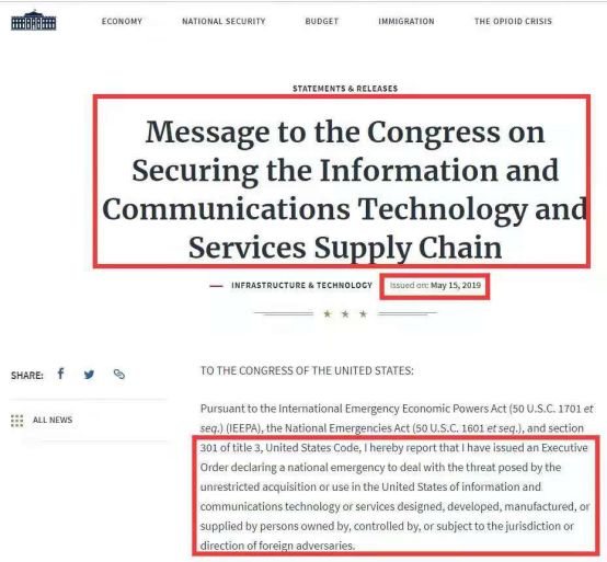 5月16日,美国总统特朗普签署行政命令,要求美国进入“紧急状态”,美国企业不得使用对国家安全构成风险的企业所生产的电信设备。同日,美国商务部工业与安全局将华为列入所谓“实体清单”,没有美国政府的许可下,美国企业将不得给华为供货。